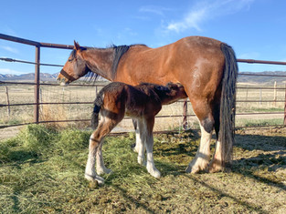 Our mare Rafter MJ Pony (AQHA x Clydesdale) had a bay roan filly early this morning!! This filly is by a blue roan Gypsy Vanner stallion who is also the sire to our 2021 F1 Drum filly Rafter MJ Martha (pictured).